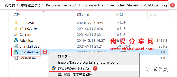 10.依次打開C:\\Program Files(x86)\\CommonFiles\\Autodesk Shared\\AdskLicensing文件夾,然后找到uninstall.exe雙擊進行卸載,文件夾內所有文件都自動消失后表示卸載完成