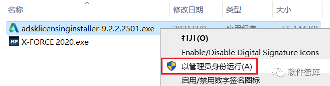 24.再次打開Crack文件夾,找到X-FORCE2020.exe,鼠標右擊選擇【以管理員身份運行】,注意:一定要“以管理員身份運行”注冊機,不然會安裝失敗