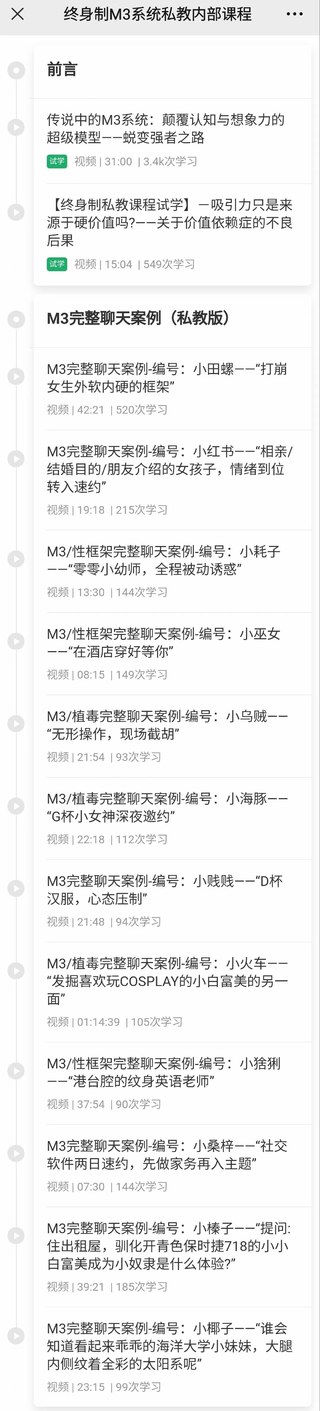 【情感會(huì)員再上新】黑貓染色體《終身制M3系統(tǒng)私教內(nèi)部課程》 M3通過(guò)情感按鈕,以吸引ta成為我們追求者、討好者,最終由我們決定是否選擇ta的一套兩性關(guān)系的模式!唯一一套把M3講的如此詳細(xì)的課程,96集系統(tǒng)課,百度網(wǎng)盤秒發(fā)。