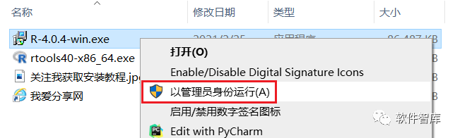 1.先使用“百度網盤客戶端”分享R404_CN_x32-64軟件安裝包到電腦磁盤里,并解壓縮,然后找到R-4.0.4-win.exe,鼠標右擊選擇【以管理員身份運行】